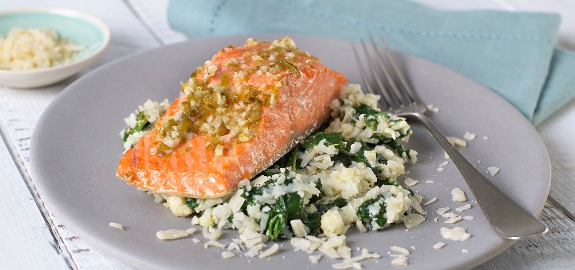 Varm opp olivenolje i en stor kasserolle og ha i spinaten. Rør om med en sleiv til den faller sammen. Riv blomkål på den grove siden på et rivjern, og ha dette i kasserollen sammen med spinaten. Rør godt og krydre med salt, pepper og muskat.