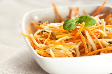 Lag "spagetti" av squash og gulrot med et julienne-jern, en ostehøvel og skjær i strimler eller bruk en spiralizer (kjøkkenredskap for strimling av grønnsaker).