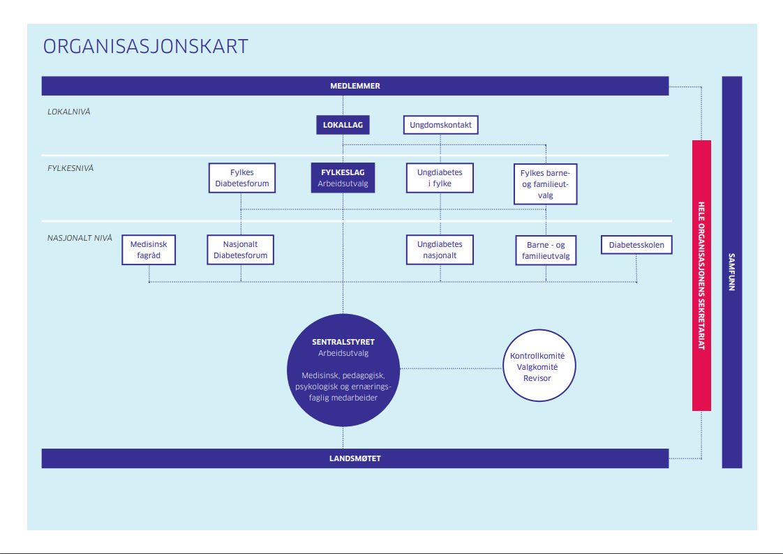 Helt til høyre ser dere at samfunnet står som en egen boks. Dette kan kanskje synes rart i et organisasjonskart, men alle i Diabetesforbundet jobber indirekte med samfunnet, da mye av vårt arbeid bidrar positivt i samfunnet både lokalt og nasjonalt. Vårt arbeid er også påvirket av avgjørelser og trender i samfunnet.