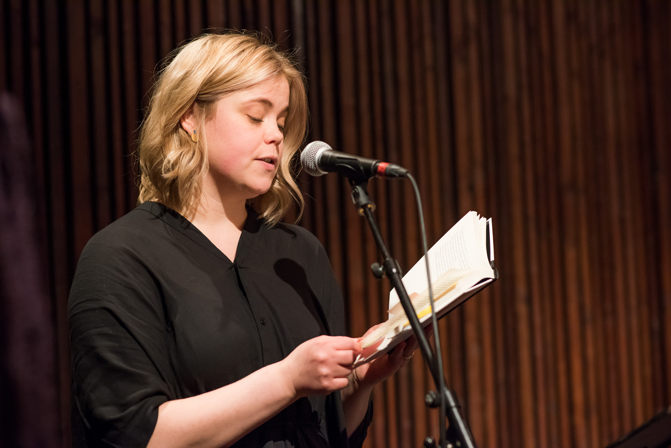 Der slapp hun til tre skrivekolleger fra forfatterutdanninger i Bø og Gøteborg, før hun selv leste tre utdrag fra «Føling».