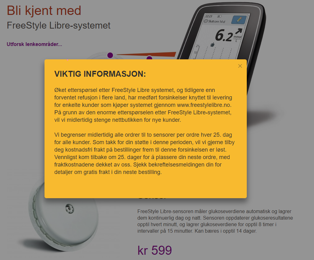 Hovedårsaken til leveringsproblemene er at helsemyndighetene i stadig flere land tilbyr den populære blodsukkermåleren med refusjon, i praksis gratis til pasientene. Dermed greier ikke Abbott å dekke etterspørselen. Under ses informasjonen fra Abbott på FreeStyle Libre-siden.